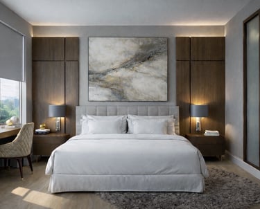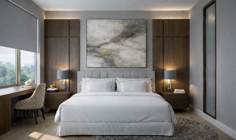 A Thoughtfully Designed Bedroom for Ultimate Comfort, Enhanced by Personalized Elements and Soft Lighting.